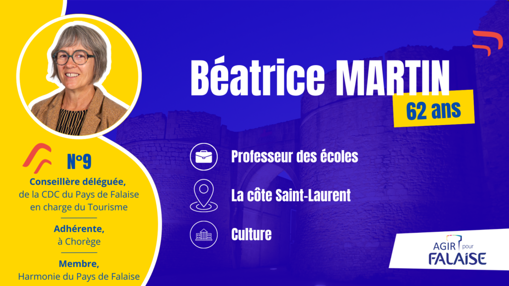 Je m’appelle Béatrice Martin. J’ai 61 ans et j’habite Falaise depuis 27 ans. Je suis enseignante. Je suis mariée et j’ai 2 enfants qui ont effectué toute leur scolarité à Falaise. Mon mari est retraité artisan. J’aime randonner, lire, aller voir des spectacles au forum…