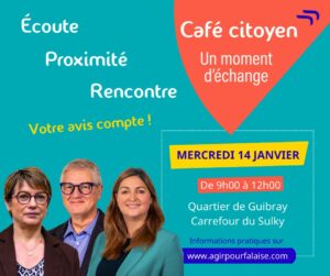 En plus de mes rencontres publiques, je vous propose une série de cafés citoyens à Falaise pour vous rencontrer autour d’un café et échanger, sans filtre ni langue de bois, sur vos idées, vos ressentis et vos propositions pour faire avancer notre ville.